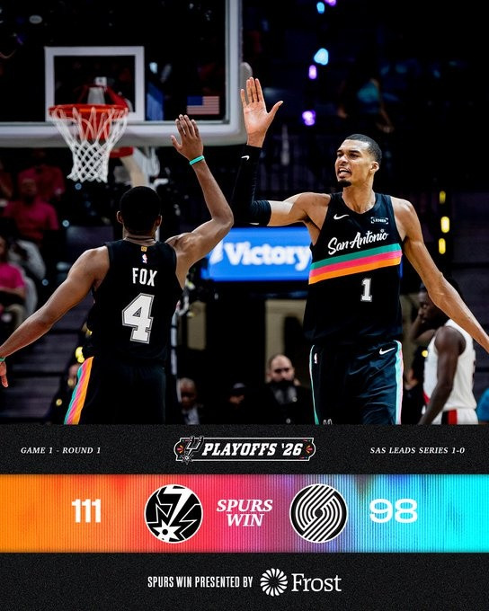 比赛结束后,马刺官推晒出了本场比赛的赢球海报,文班和福克斯登上封面。